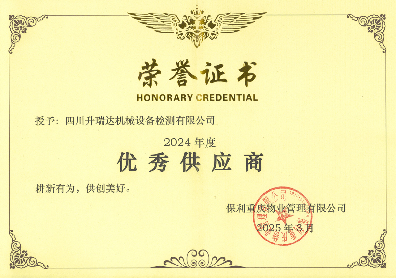 ? ? ? ?保利重慶物業(yè)管理有限公司正式授予四川升瑞達(dá)機(jī)械設(shè)備檢測(cè)有限公司 “優(yōu)秀供應(yīng)商” 殊榮。這一榮譽(yù),不僅是對(duì)我們過(guò)往不懈努力的高度認(rèn)可,更是開(kāi)啟我們邁向更高征程的全新起點(diǎn)。